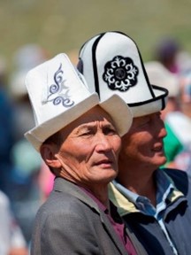 The traditional headwear for many men in Kyrgyzstan is a pointed, felt hat called a Kalpak.